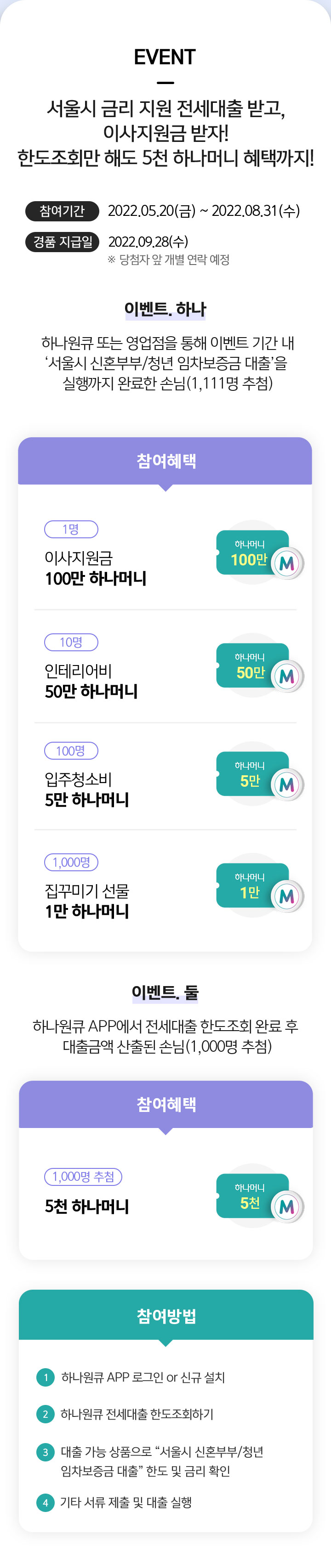 - “이벤트 하나” 참여 대상은 이벤트 기간 내 하나원큐, 전국 하나은행 영업점에서 “(원큐)서울특별시 신혼부부 임차보증금대출“ 및 “(원큐)서울특별시 청년 임차보증금대출“