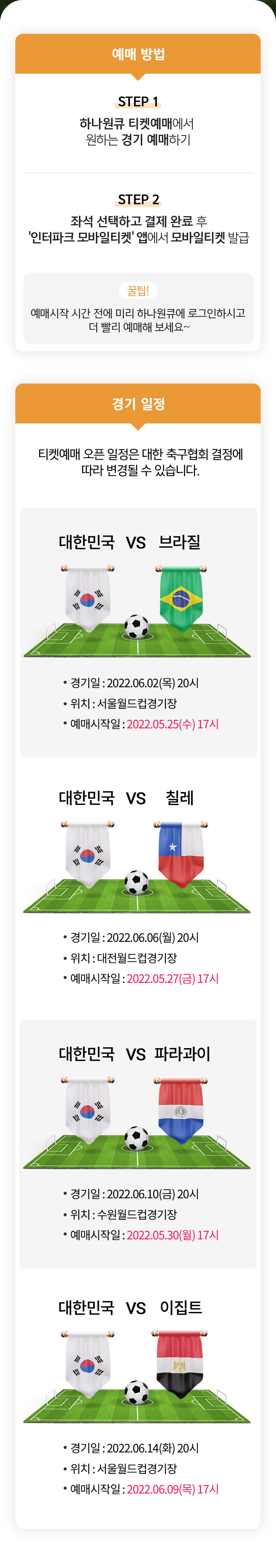티켓예매 오픈 일정은 대한 축구협회 결정에 따라 변경될 수 있습니다.