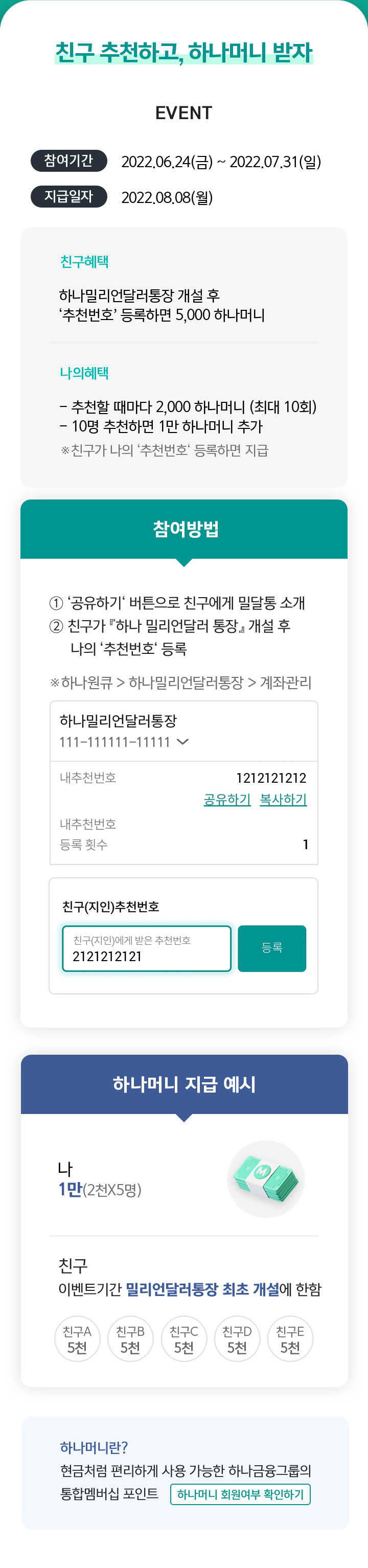 - 하나밀리언달러통장 개설 후 '추천번호' 등록하면 5,000 하나머니