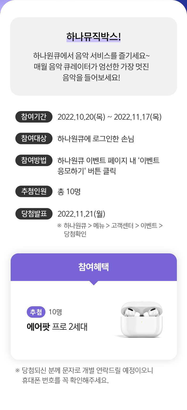 [이벤트] 하나원큐 X 지니뮤직 하나뮤직박스 ON! 에어팟 프로2 행운!