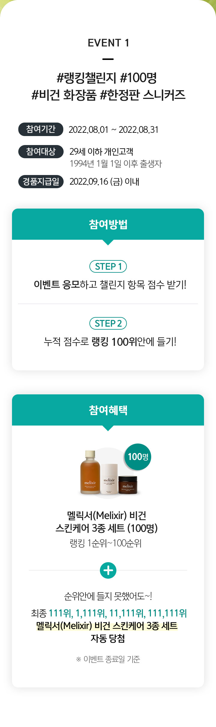 - 최종 111위, 1,111위, 11,111위, 111,111위 멜릭서(Melixir) 비건 스킨케어 3종 세트 자동 당첨 / ※ 이벤트 종료일 기준