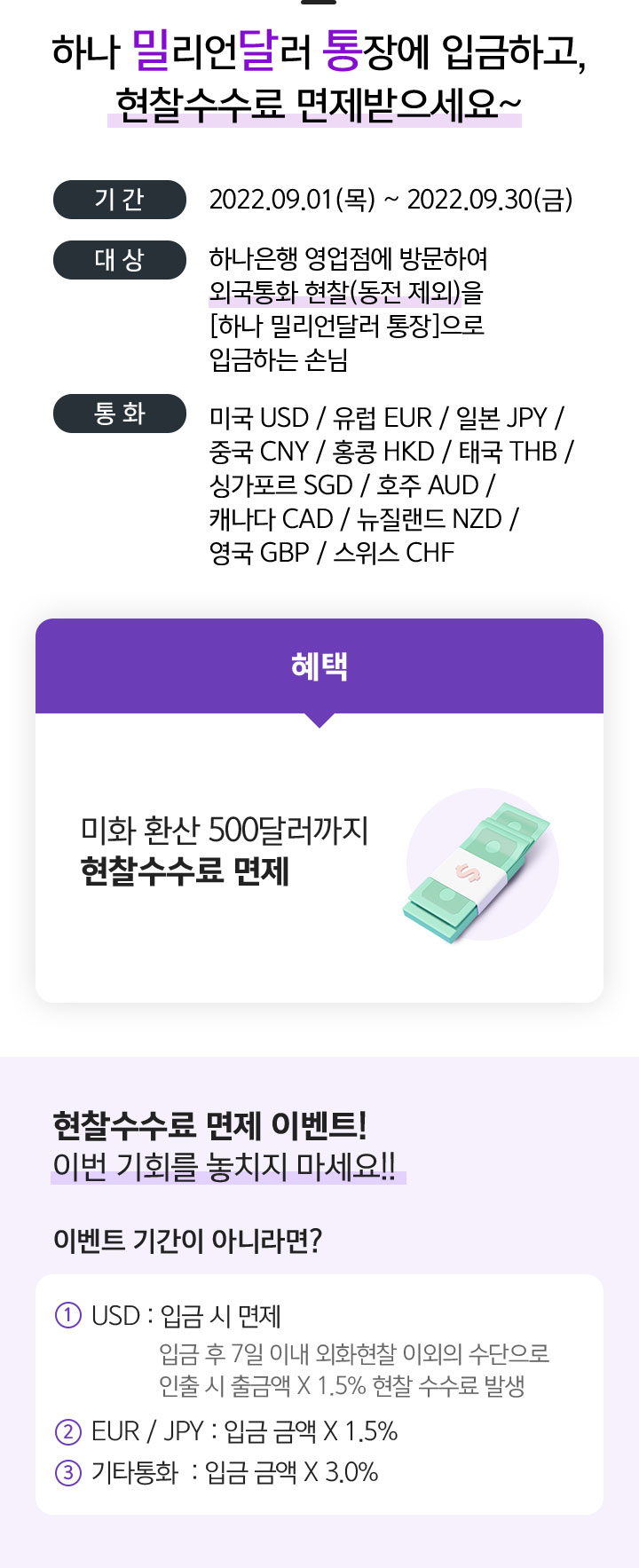 하나 밀리언달러 통장에 입금하고, 현찰수수료 면제받으세요~