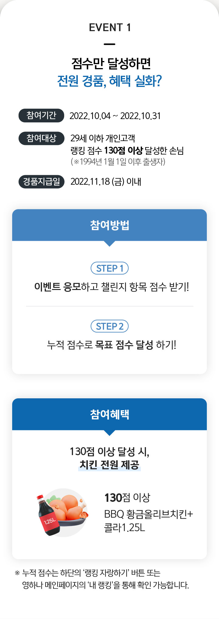 29세 이하 개인고객 랭킹 점수 130점 이상 달성한 손님(※ 1994년 1월 1일 이후 출생자)
