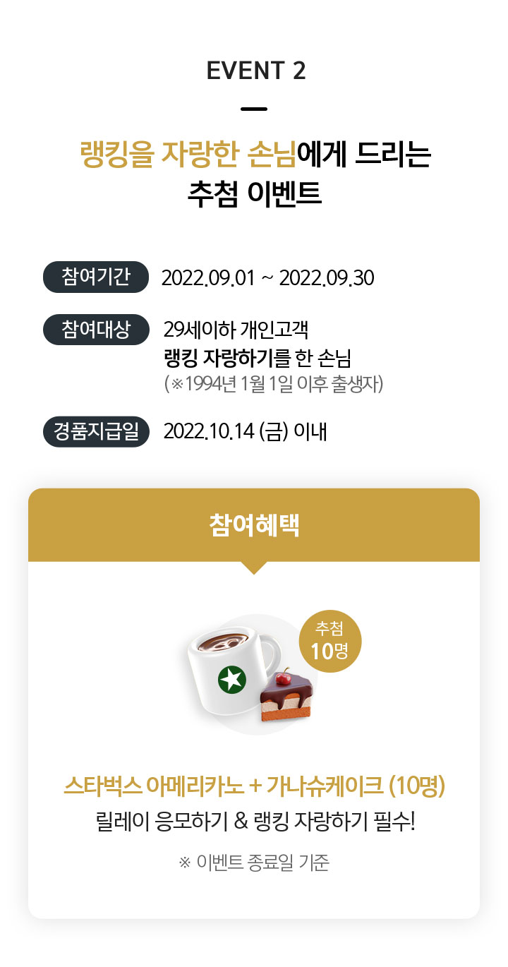 EVENT2 경품은 경품 수령 시점(2022년 11월 18일)까지 이벤트 기간 중 가입한 상품이 전부 유지되고 있어야 합니다.