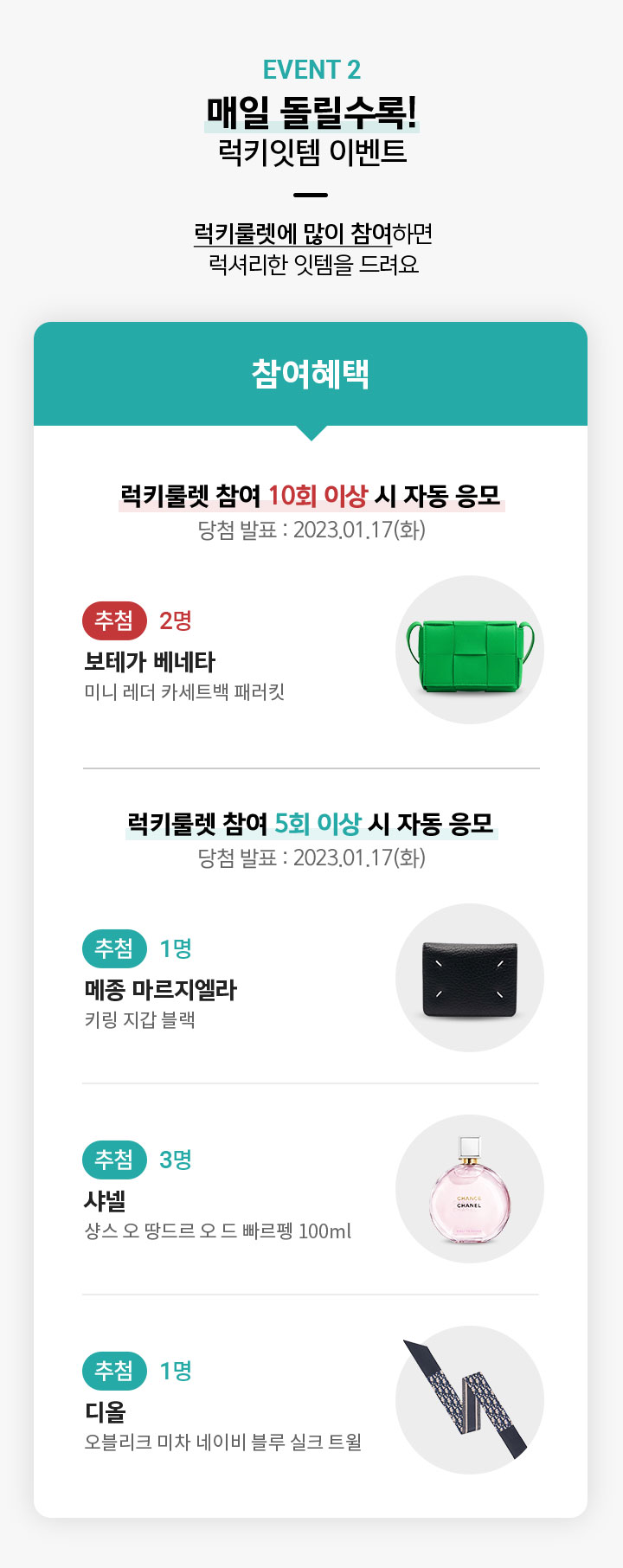 - 럭키룰렛 참여 5회 이상 시 자동 응모 (당첨 발표 : 2023년 1월 17일(화)