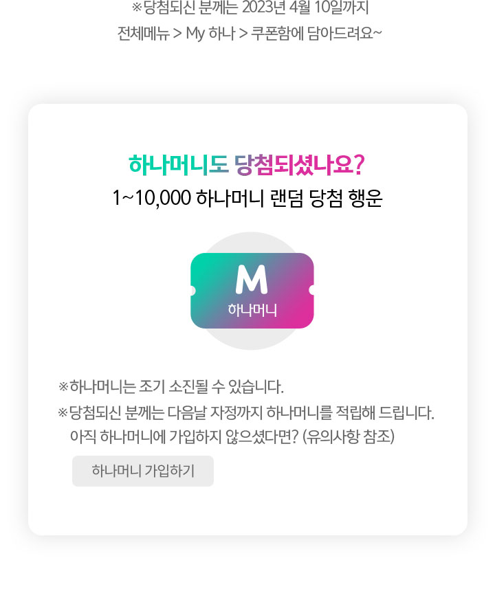 ※당첨되신 분께는 2023년 4월 10일까지 전체메뉴 > My 하나 > 쿠폰함에 담아드려요~