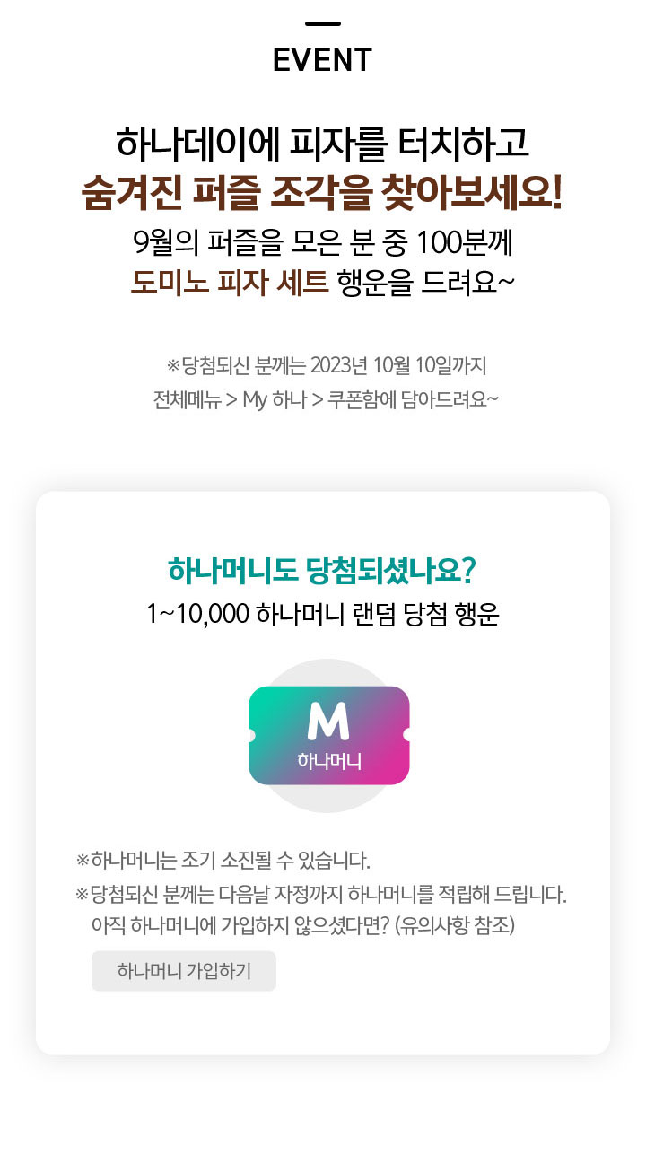 하나데이에 피자를 터치하고 숨겨진 퍼즐 조각을 찾아보세요! 9월의 퍼즐을 모은 분 중 100분께 도미노 피자 세트 행운을 드려요~