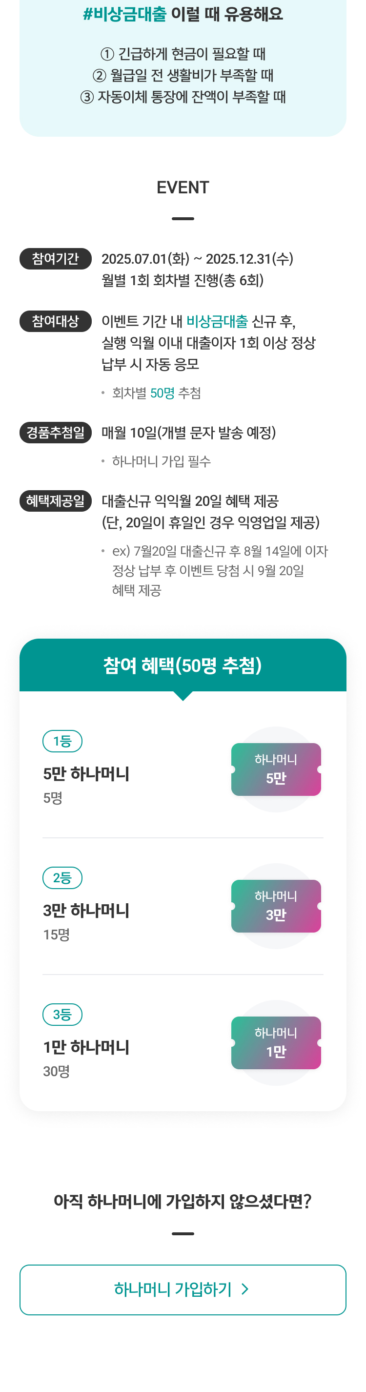 당첨자 앞 혜택 제공 시기: 대출 익익월 20일 (예시: 7월 20일 대출 신규시 9월 20일 하나머니 적립)