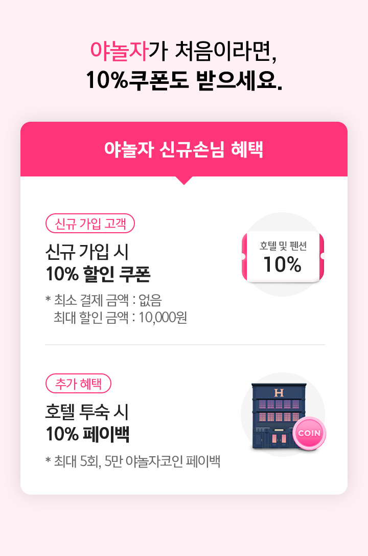 * 최소 결제 금액 : 없음 최대 할인 금액 : 10,000원(추가 혜택) 호텔 투숙 시 10% 페이백