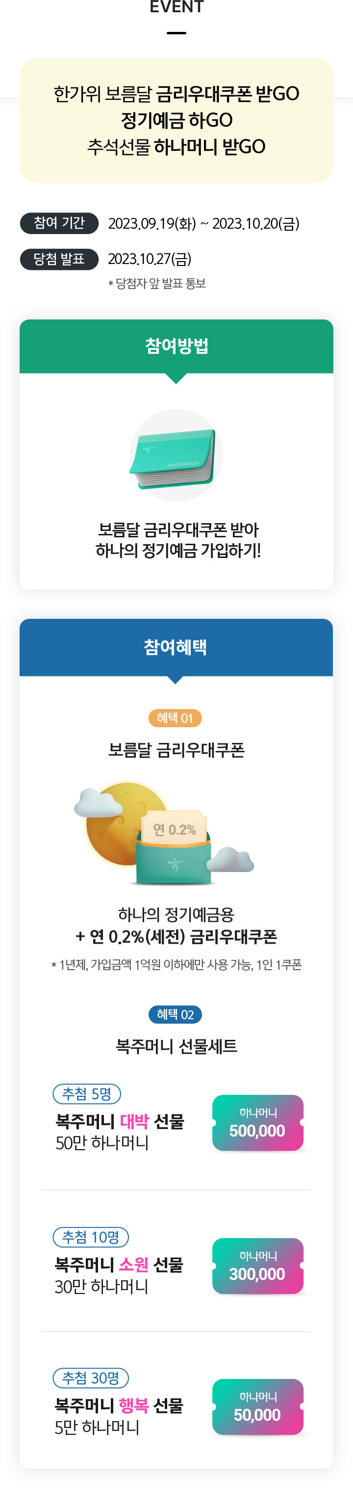 - 본 이벤트의 대상상품인 하나의 정기예금 금리는 가입일 시장상황에 따라 변경될 수 있습니다.