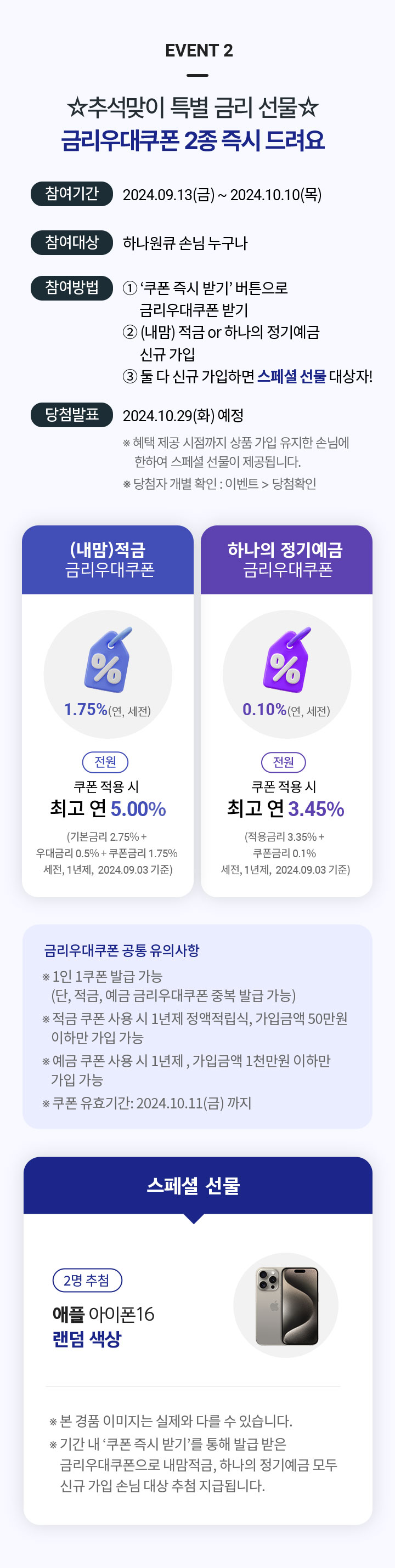 ※ 기간 내 ‘쿠폰 즉시 받기‘를 통해 발급 받은 금리우대쿠폰으로 내맘적금, 하나의 정기예금 모두 신규 가입 손님 대상 추첨 지급됩니다.