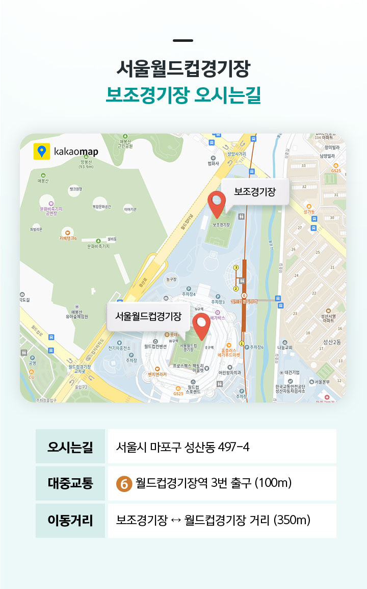 | 이동거리 | 보조경기장 ↔ 월드컵경기장 거리 (350m) |