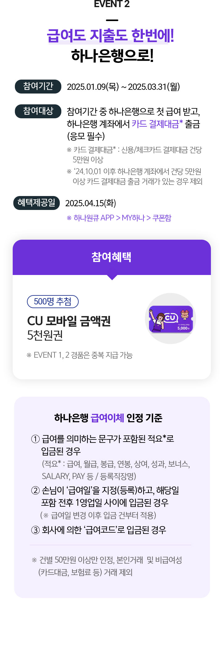 - 참여기간 중 하나은행으로 첫 급여 받고, 하나은행 계좌에서 카드 결제대금* 출금 (응모 필수)