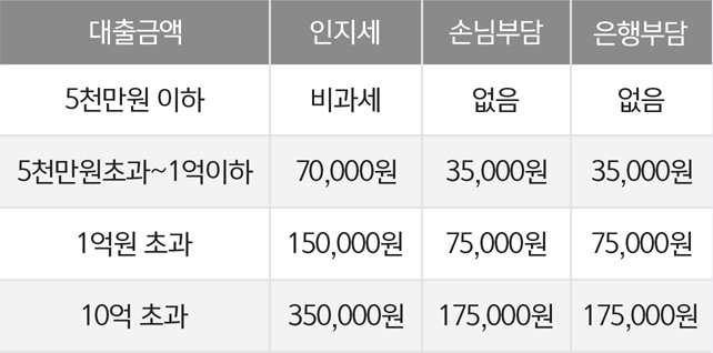 | 대출금액 | 인지세 | 손님부담 | 은행부담 |