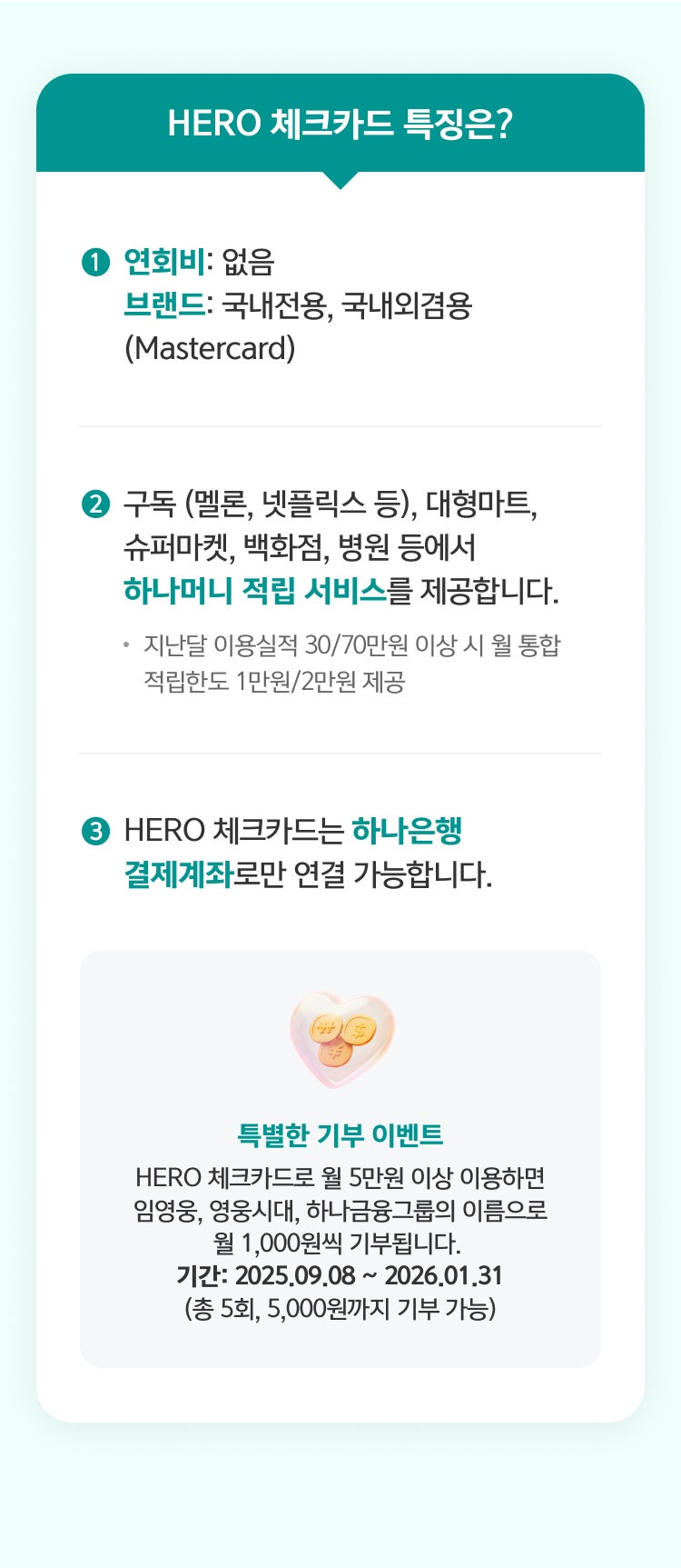 특별한 기부 이벤트 HERO 체크카드로 월 5만원 이상 사용하면 임영웅, 영웅시대, 하나금융그룹의 이름으로 월 1,000원씩 기부됩니다. 기간: 2025.09.08 ~ 2026.01.31 (총 5회, 5,000원까지 기부 가능)
