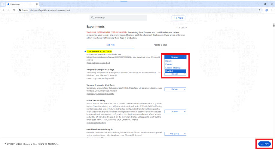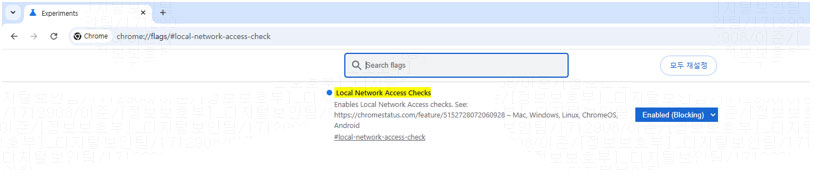 크롬 주소창에 chrome://flags/#local-network-access-check 검색 > “disabled” 선택 후 다시시작 버튼 클릭